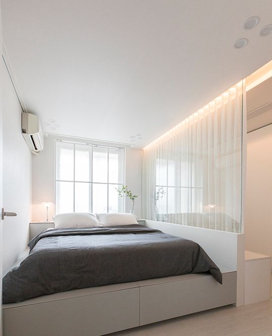 主卧一床之隔,可以用玻璃拼接半墙做衣帽间的隔断,后方空间专门用来做存储,衣物和鞋子通通放在此处不占太多空间。给上方用简易灯带做空间照明,装饰的效果就很好了。